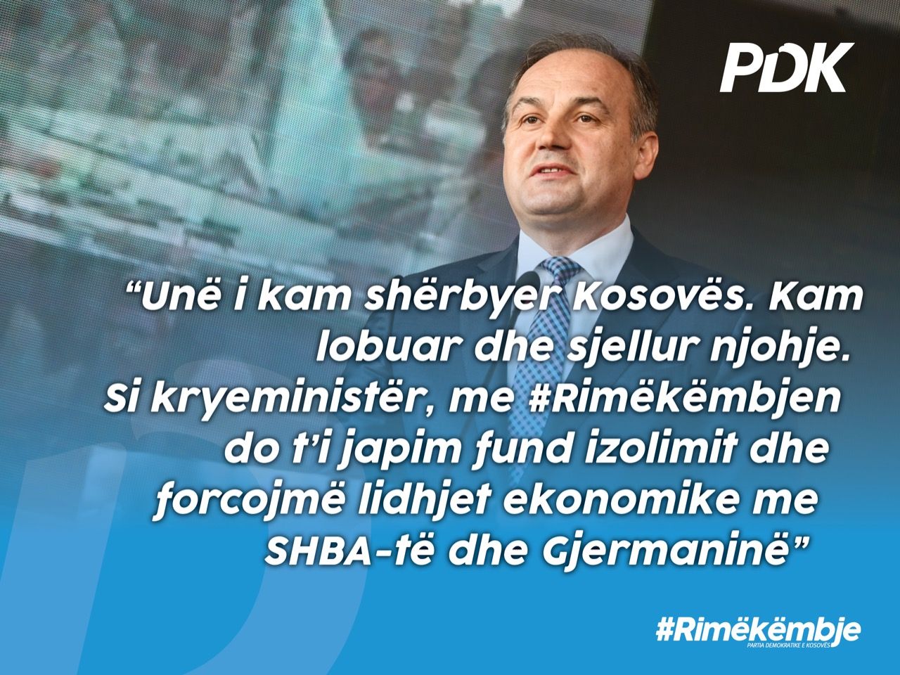 Plani i rimëkëmbjes së politikës së jashtme dhe promovimit të Kosovës do t’i jap fund izolimit të qytetarëve dhe shtetit tonë. Si kryeministër i ardhshëm do t’i forcoj edhe më shumë lidhjet politike dhe ekonomike të Kosovës me miqtë ndërkombëtarë si SHBA-të, BE-në dhe ato vëllazërore me Shqipërinë.